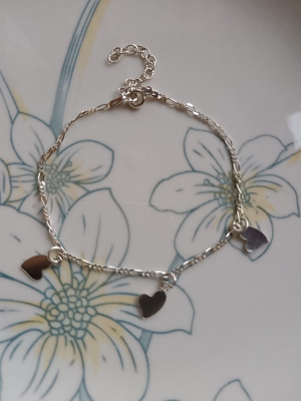 Hermosa pulsera con 3 corazones planos, plata 925 de 18 cm, más 5cm de extensión, total 23cm.