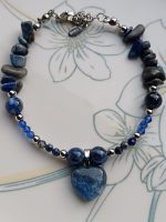Es lapislázuli nacional , mide 19cm con una extensión adicional de 5cm más, con cierre y separadores de acero, y un dije corazón de 1cm.
